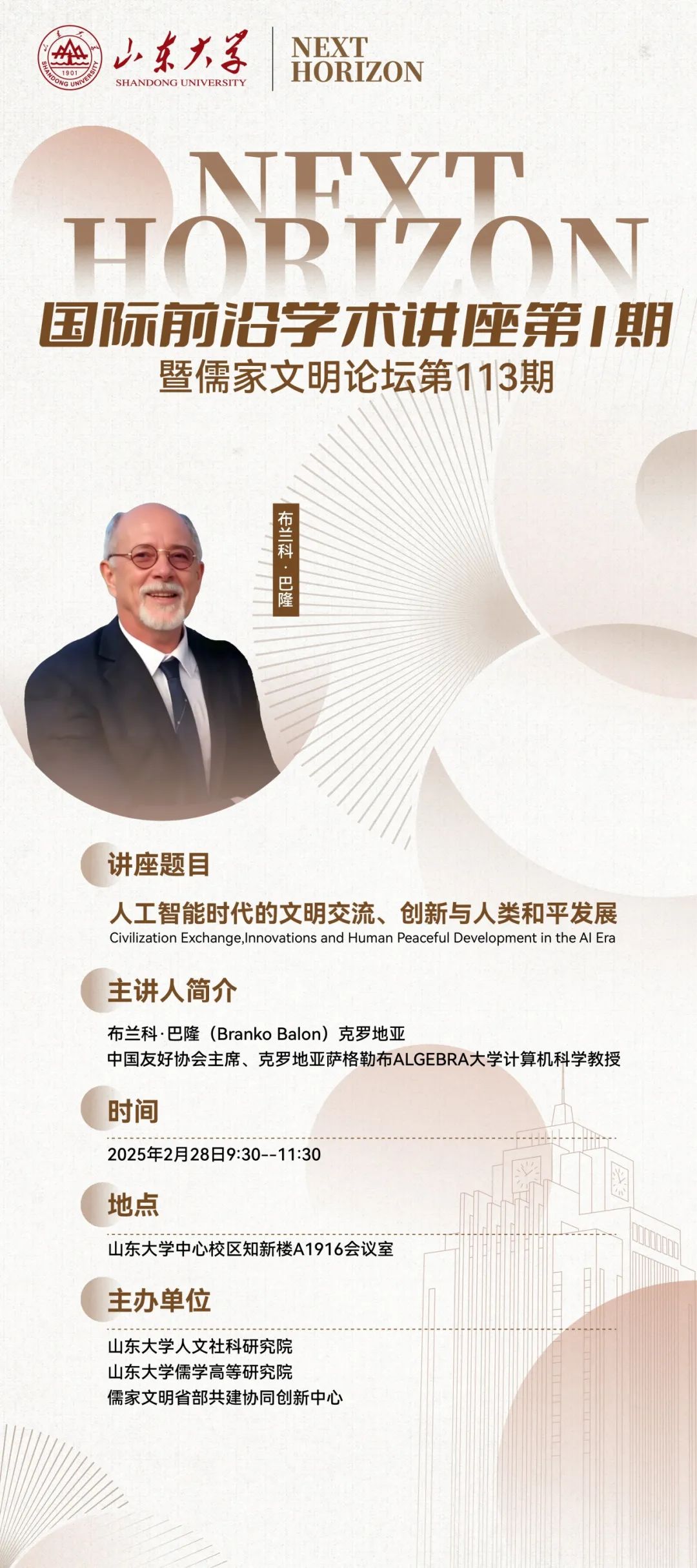 布兰科·巴隆(Branko Balon),克罗地亚——中国友好协会主席,巴隆教授对中国哲学和文化有着浓厚的兴趣,自 1995 年以来一直深入研究中国文化和道教。自 2018 年起,巴隆教授担任克罗地亚萨格勒布的克罗地亚——中国文化、科学和经济合作友好协会主席。2023年8月,巴隆教授在中国驻萨格勒布大使馆签署了山东省人民对外友好协会与克罗地亚——中国友好协会交流合作谅解备忘录。2024年,作为克中友好协会“马可·波罗与现代丝绸之路”项目的一部分,巴隆教授举办了以马可·波罗访华及其对欧洲文化的影响为主题的讲座。