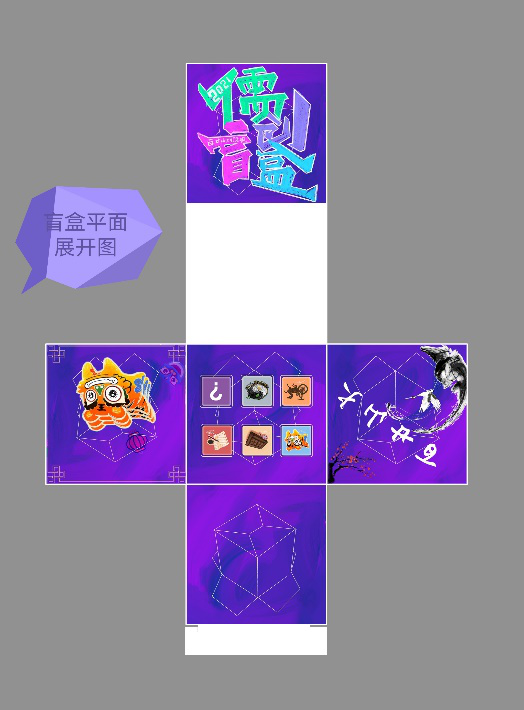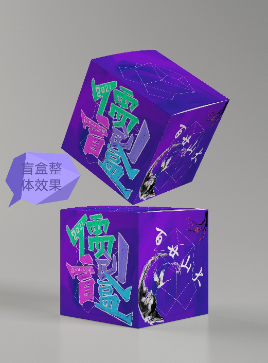 作品立意:盲盒作为一种随机性的体验,成为年轻人的“彩票”,这种不确定的刺激加强了参与者的兴趣。而作品的主色调——紫色恰好营造了这种刺激且梦幻的氛围,盲盒的正面体现了作品的设计动机,旨在设计出具有百廿山大纪念意义的儒院盲盒;盲盒的侧面体现儒院的专业设置;盲盒的底部为空白面,寓意新的篇章等待着后辈书写。(专业元素来自尚頔)