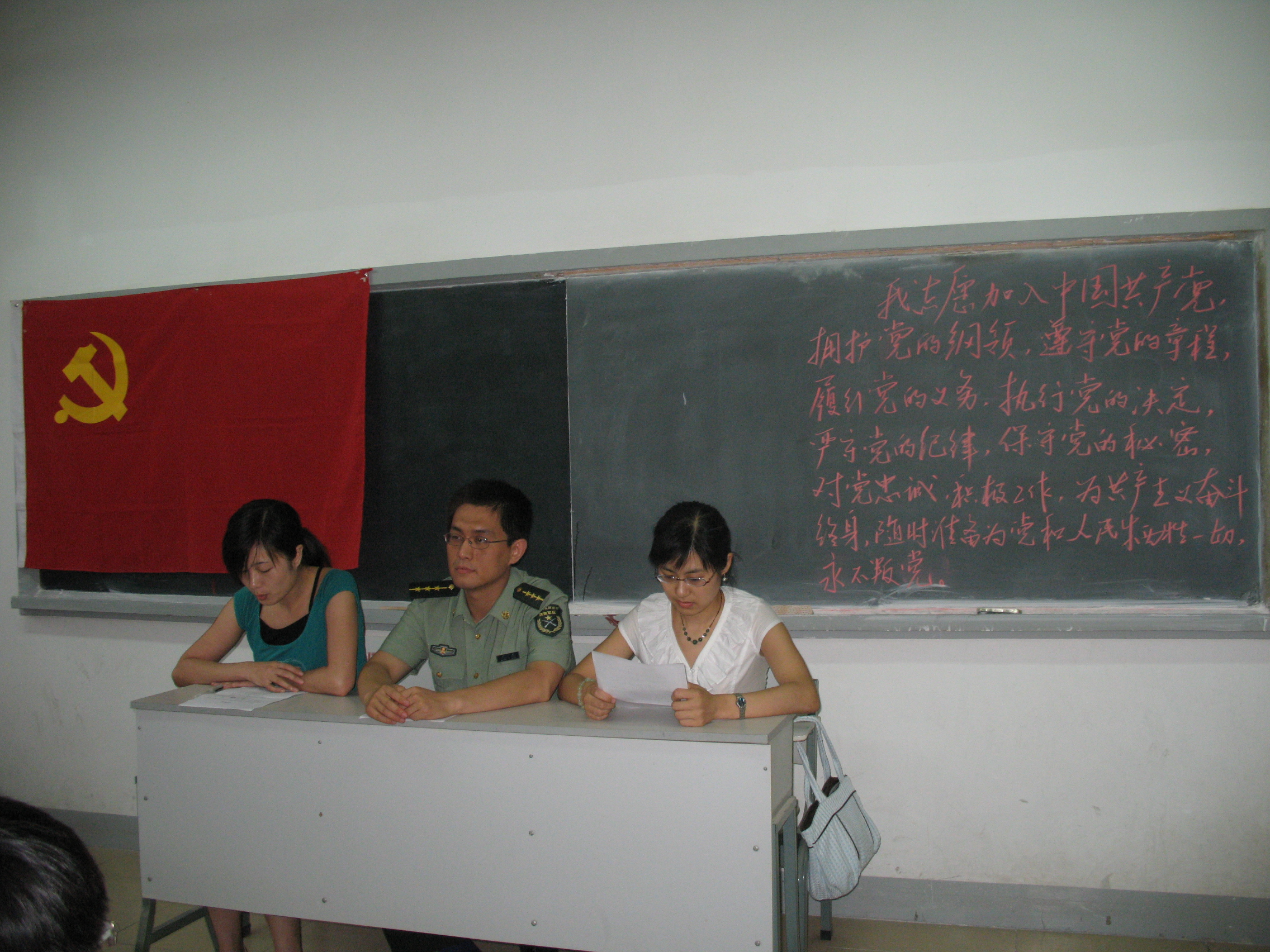 我院2006级研究生党支部第二批预备党员入党宣誓仪式于6月11日19时整在院会议室举行,2006级全体党员和部分入党积极分子参加了会议,济南军区某海防团送学干部、2006级研究生党支部书记王震,支部组织委员张倩,副宣传委员胡静在前排就座。仪式由张倩同志主持。