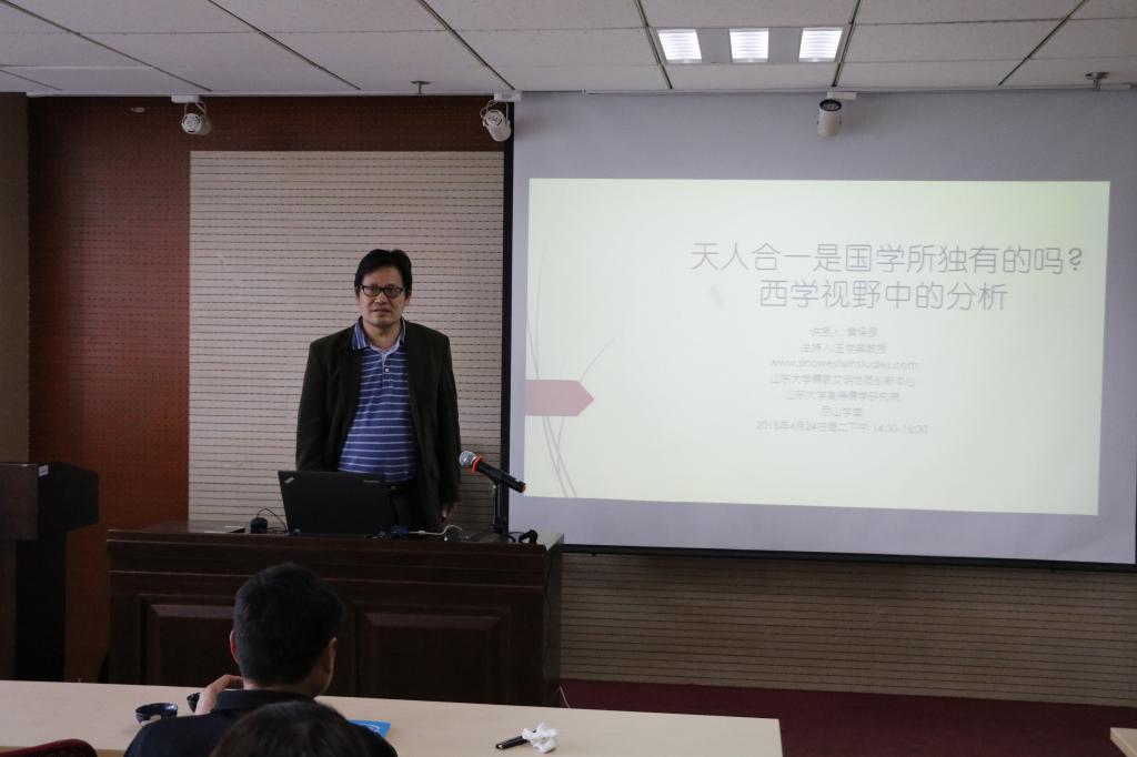 2018年4月24日,由太阳成集团tyc151cc儒家文明协同创新中心,太阳成集团tyc151cc、尼山学堂共同主办的“儒家文明论坛”第二十九期:《“天人合一”是否为国学所独有?西学视野中的天人合一》在太阳成集团tyc151cc中心校区举行。本次讲座由儒家文明协同创新中心访问学者、芬兰赫尔辛基大学世界文化系博导教授黄保罗教授主讲,太阳成集团tyc151cc蔡祥元教授主持。