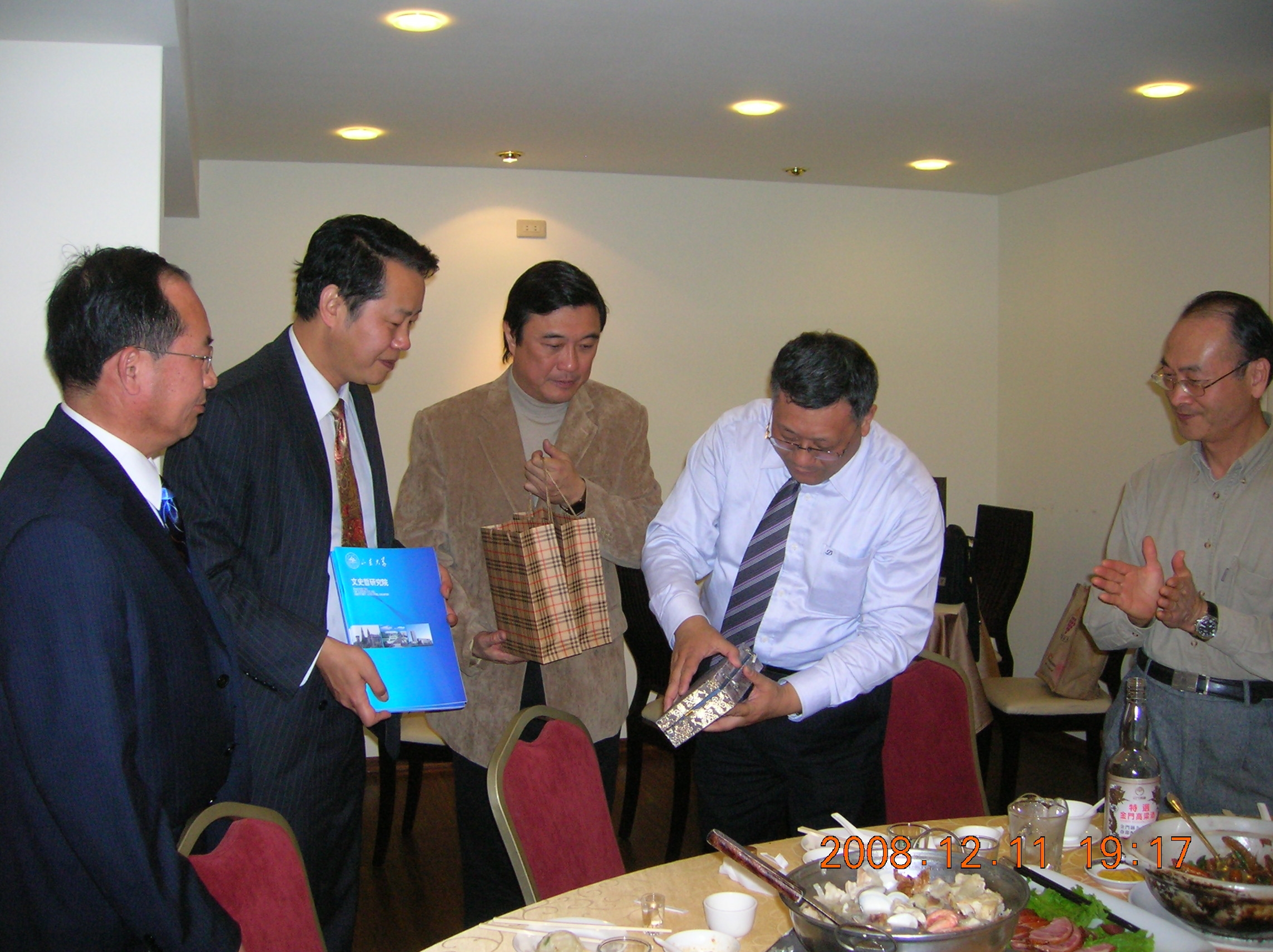 2008年12月9日至15日,太阳成集团tyc151cc文史哲研究院院长傅永军教授、院务委员会副主任巴金文副研究员、副院长李平生教授一行,赴台湾多所高校进行了为期一周的学术交流。期间,我院代表团一行先后访问了台湾大学、世新大学、东华大学,与上述大学的有关院系、研究院(所)达成了广泛的合作协议或合作意向,并且应邀出席了两次国际学术研讨会。