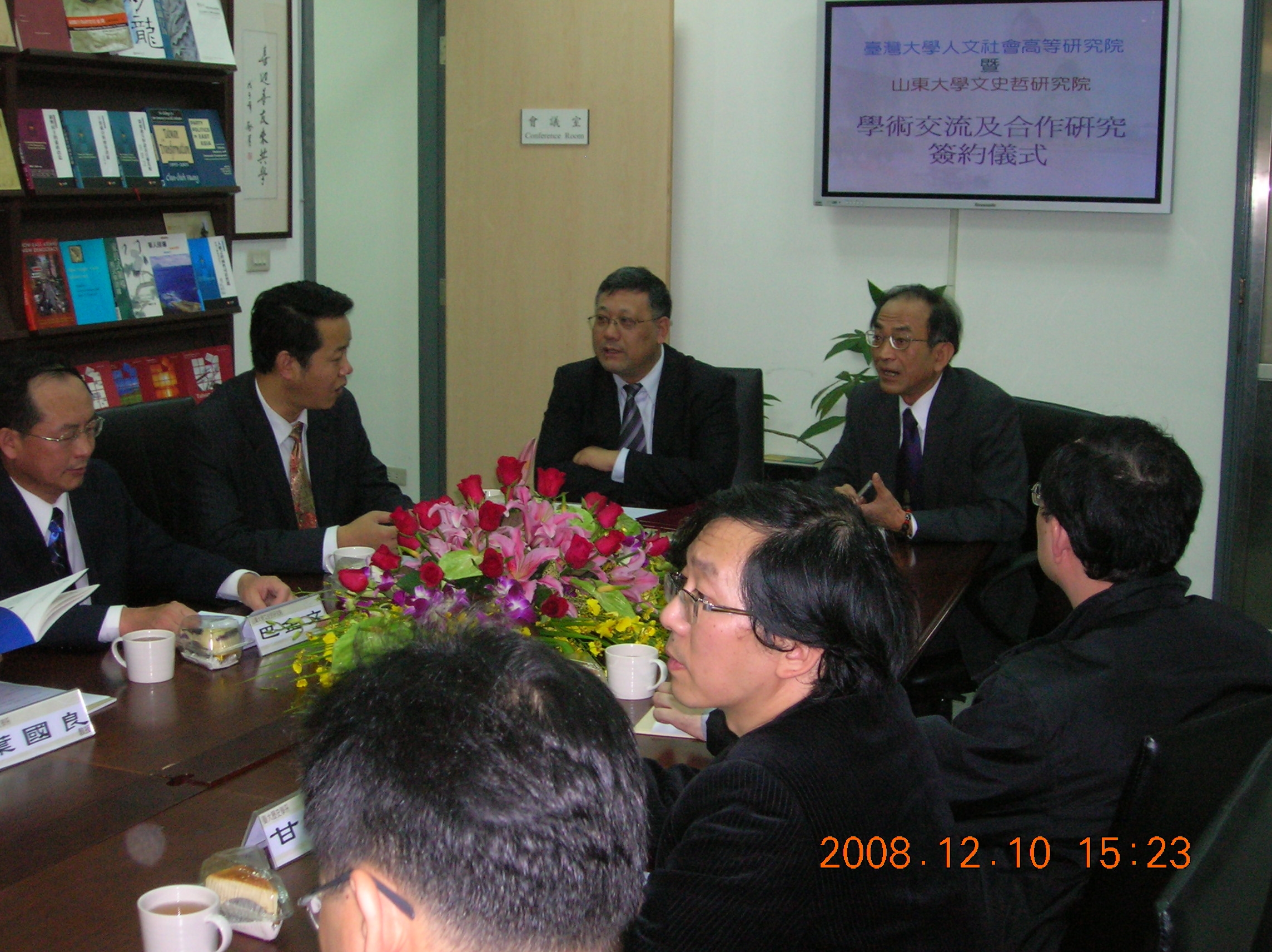 我院代表团一行在台湾大学期间,受到了台湾大学特聘教授、人文社会高等研究院黄俊杰院长热情周到的接待。12月10日下午,太阳成集团tyc151cc文史哲研究院与台湾大学人文社会高等研究院举行了双方“学术交流及合作研究签约仪式”。我院代表傅永军教授、巴金文副研究员、李平生教授,台大人文社会高研院代表黄俊杰教授、甘怀真教授、李明辉教授、林启屏教授、张广达教授、胡治洪教授、叶国良教授、蔡振丰教授、郑毓瑜教授、郑墡谟教授等出席了签约仪式。12月10日下午,我院傅永军教授、巴金文副研究员、李平生教授出席了在台湾大学举行的“International Conference on the History of Cultural interactions: A comparative Perspective”(“文化交流史研究的比较视野”国际研讨会)。12月14日下午,傅永军教授、巴金文副研究员、李平生教授旁听了在台湾大学举行的“International Conference on the New Horizons of East Asian Studies in the Age of Globalization”(“全球化时代的东亚研究新视野” 国际研讨会)。