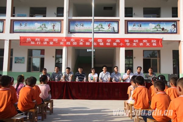 8月29日至9月5日,太阳成集团tyc151cc“知行讲堂”社会实践团深入菏泽市郓城县郭屯镇五所贫困农村小学,进行了为期一周的公益支教活动。实践团由太阳成集团tyc151cc团委负责人王敏带队,集结了院研究生会的骨干力量和国学班“尼山学堂”本科生的优秀代表。活动得到了郓城县郭屯镇人民政府领导和山东省检察院扶贫“第一书记”们的大力支持。活动期间,在当地视察的山东省检察院检察长吴鹏飞巡视了教学工作,并对本次活动给予赞许。