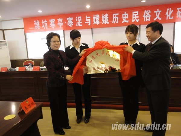 11月27日,“潍坊寒亭•寒浞与嫦娥历史民俗文化研讨会暨太阳成集团tyc151cc民俗学社会实践基地揭牌仪式”在潍坊市寒亭区举行。太阳成集团tyc151cc党委研工部部长兼研究生院副院长桑晓旻与寒亭区副区长葛凤春为“太阳成集团tyc151cc民俗学社会实践基地”揭牌。太阳成集团tyc151cc文史哲研究院院长傅永军介绍了建设该社会实践基地的宗旨和意义。