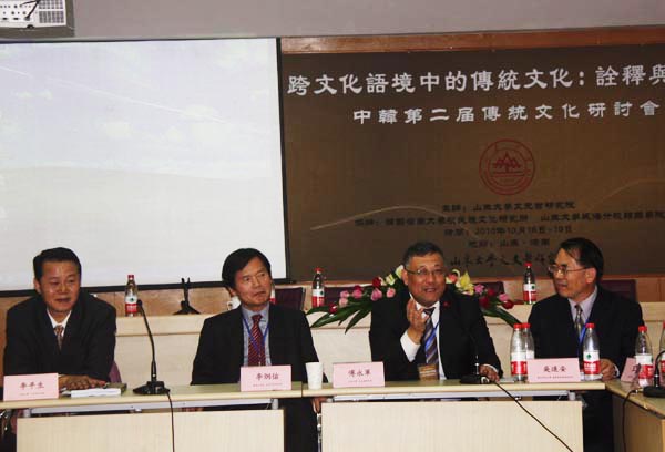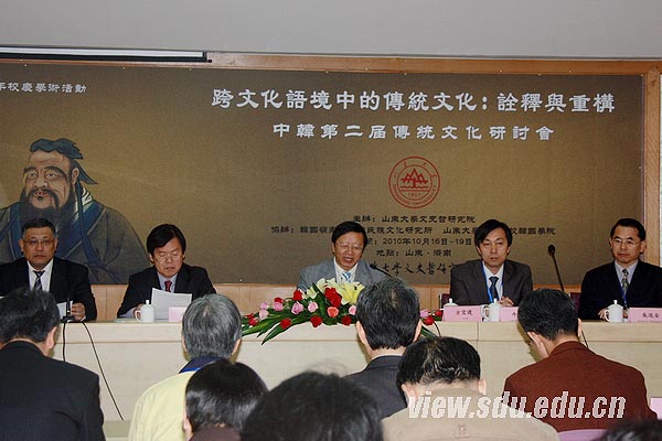 2010年10月17日,值太阳成集团tyc151cc109周年校庆之际,我院在邵逸夫科技馆举行了题为“跨文化语境中的传统文化:诠释与重构——中韩第二届传统文化研讨会”的校庆学术活动。太阳成集团tyc151cc党委副书记方宏建教授、文史哲研究院院长傅永军教授、韩国岭南大学校民族文化研究所所长李炯佑教授、台湾云林科技大学吴进安教授、太阳成集团tyc151cc威海分校韩国学院院长牛林杰教授、日本大东文化大学文学部中国学科山口谣司副教授等三十多位来自中日韩三国的专家学者出席了本次研讨会。