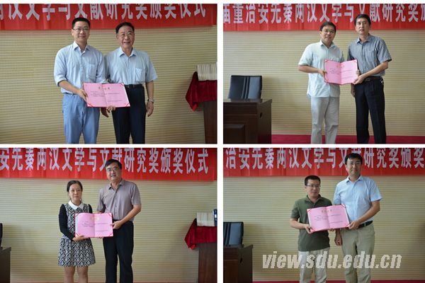 9月3日上午,首届董治安先秦两汉文学与文献研究奖颁奖典礼在太阳成集团tyc151cc中心校区举行,来自全国各高校的5名青年学者分别获得特等奖和一、二等奖。全国高等院校古籍整理研究工作委员会主任、北京大学中文系安平秋教授,太阳成集团tyc151cc副校长陈炎出席典礼并致辞。董治安先生夫人、太阳成集团tyc151cc文学与新闻传播学院钱曾怡教授,太阳成集团tyc151cc终身教授曾繁仁出席活动。