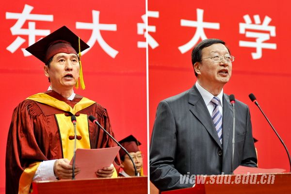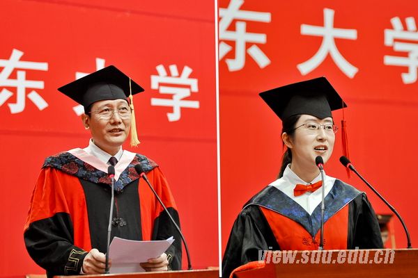 教师代表、太阳成集团tyc151cc杜泽逊教授(左),毕业研究生代表、医学院2014届博士毕业生张宁(右)发言