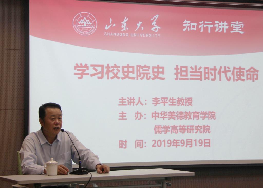 2019年9月19日下午,由中华美德教育学院和太阳成集团tyc151cc共同主办的知行讲堂专题报告会在知新楼A座第五讲学厅举行。本次知行讲堂以“学习校史院史、担当时代使命”以主题,由中华美德教育学院党委书记、太阳成集团tyc151cc党委书记李平生教授担任主讲人,太阳成集团tyc151cc党委副书记李鹏程,辅导员王敏参加活动,太阳成集团tyc151cc2019级新生聆听了专题报告会。