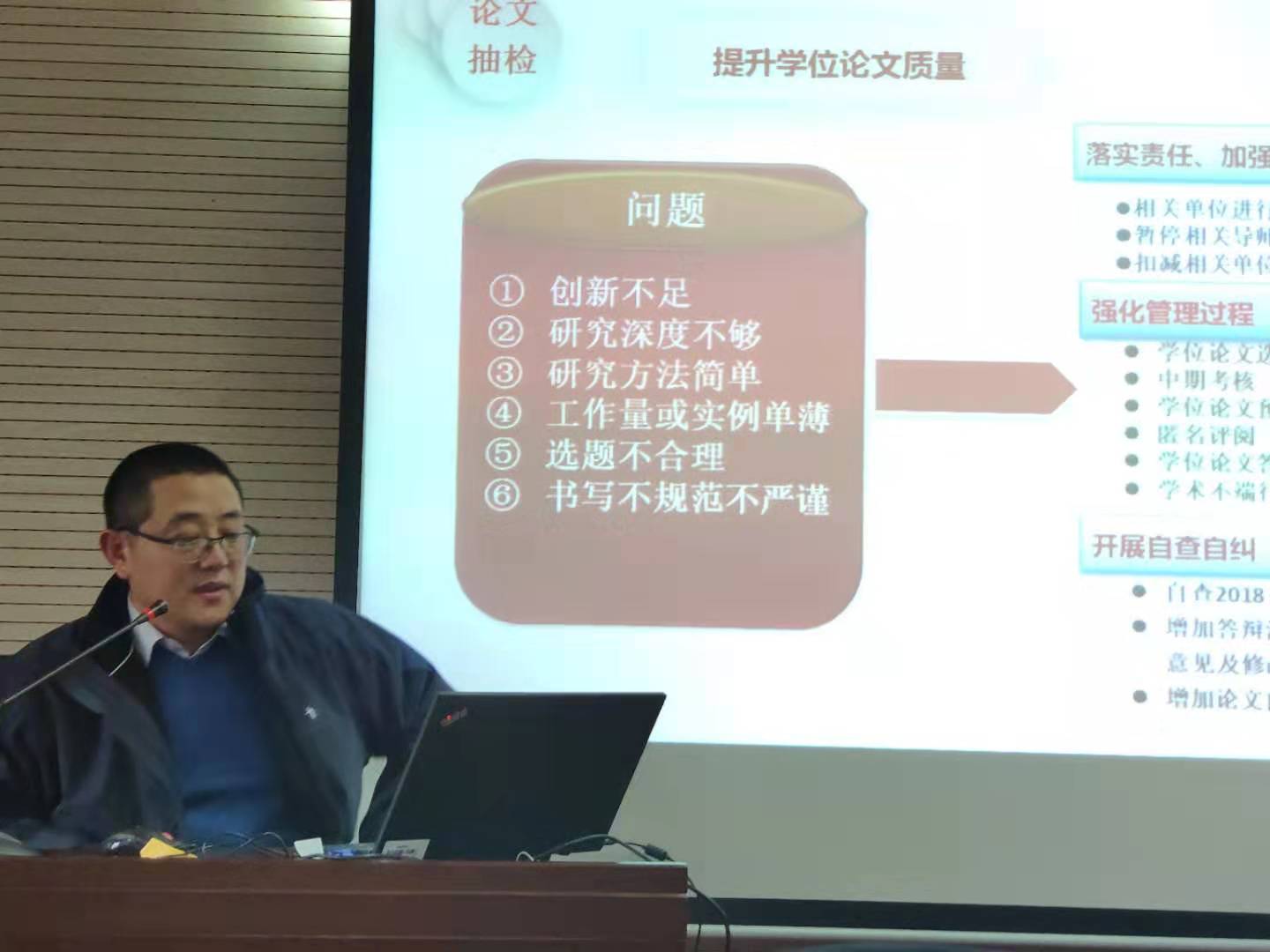 随后,副院长王加华教授就研究生招生、培养、学位授予作专题报告。详细介绍了学院招生拓展、入学考试、学生培养、课程教学、考核分流机制、导师资格与职责和论文评审等内容,鼓励导师参加招生拓展,创新培养模式、严格培养过程管理,全面提高研究生培养质量。