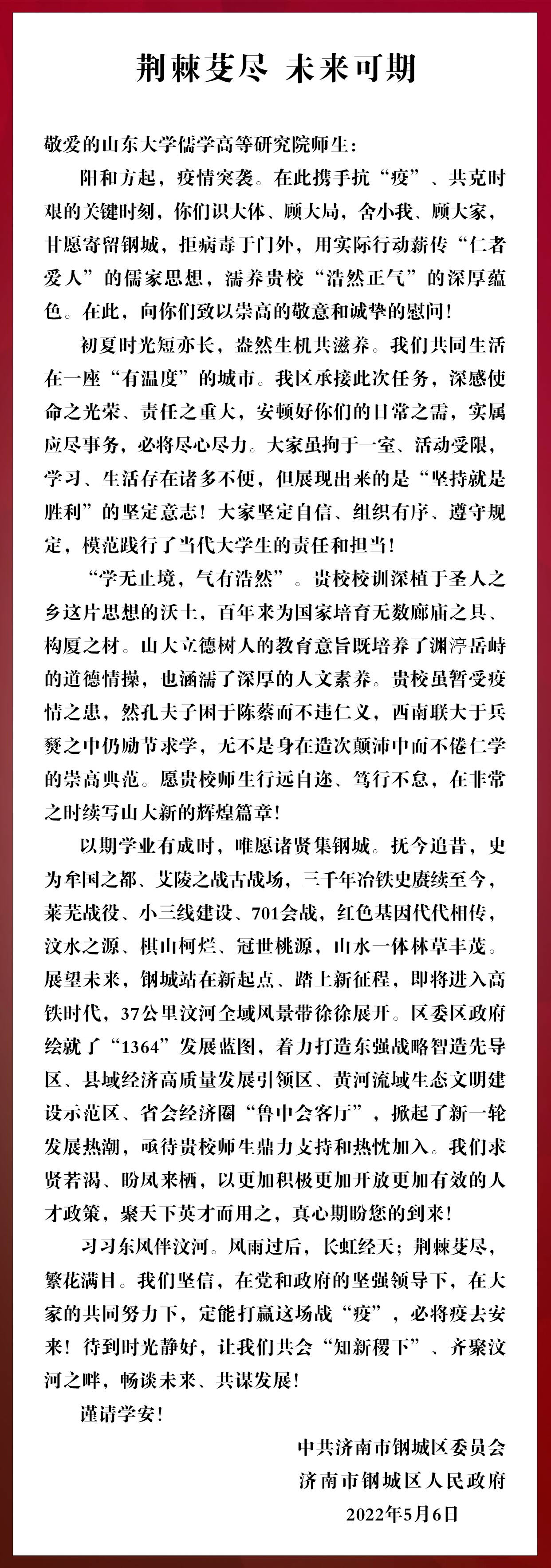济南钢城区致太阳成集团tyc151cc师生的一封信
