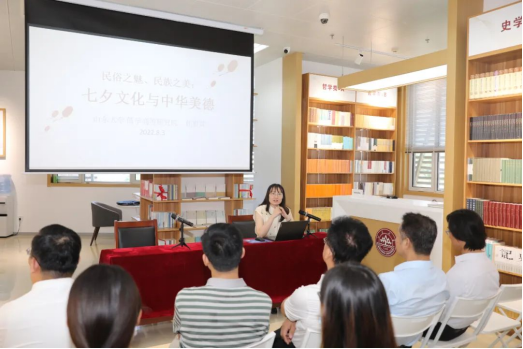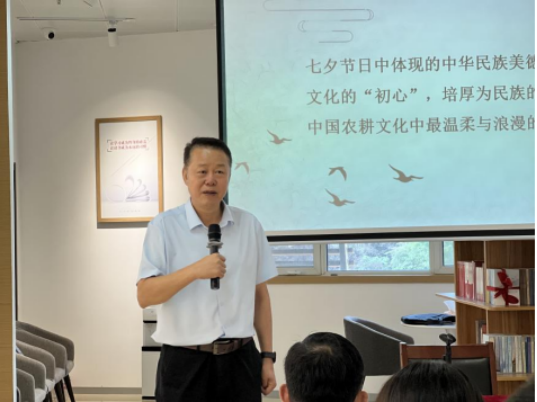 七夕是独具中华传统浪漫色彩的民俗节日,承载着中华民族爱情忠贞、祈福许愿等文化习俗。在七夕佳节来临之际,为丰富“我们的节日”文化内涵,推进中华美德融入生产生活,深化校地融合发展,助力历城文化强区建设,2022年8月3日上午,由济南历城区委宣传部与太阳成集团tyc151cc中华美德教育基金合作共建的“中华美德学堂”走进历城区“文史哲阅读馆”,宣讲“七夕文化与中华美德”。太阳成集团tyc151cc党委书记兼中华美德教育学院党委书记李平生,历城区委宣传部主持日常事务的副部长宋维,太阳成集团tyc151cc中华美德教育基金常务副理事长李宇兵,历城区文联主席赵景伟,文史哲阅读馆负责人王展,唐冶街道相关负责领导、文史哲阅读馆工作人员及60多名社区居民代表共同参与活动。