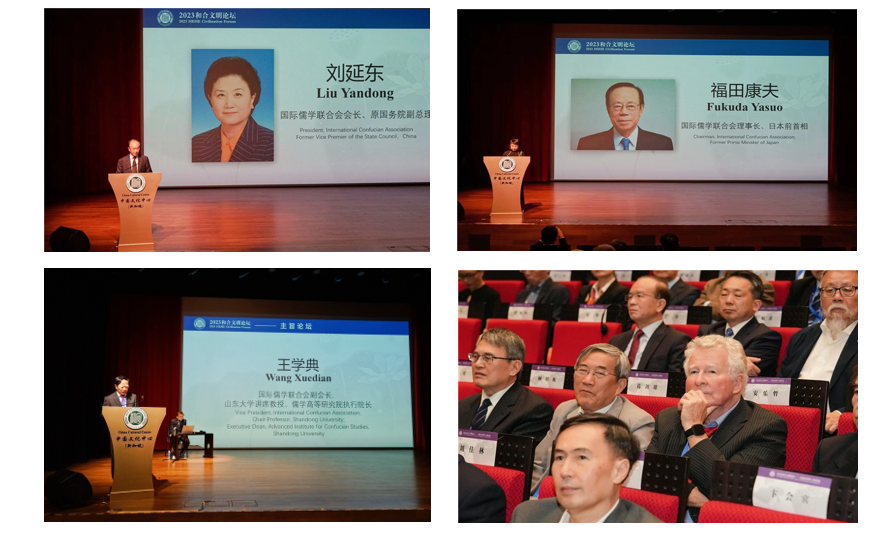 在开幕式环节,国际儒学联合会会长刘延东和国际儒学联合会理事长、日本前首相福田康夫分别发表书面致辞。中国驻新加坡大使馆临时代办朱憬、中国人民对外友好协会副会长袁敏道、上海交通大学副校长张兆国、新加坡南洋理工大学副校长翁之昊(Luke Ong)、新加坡中国协会会长谢永德、联合国教科文组织社会科学和人文科学助理总干事拉莫斯(Gabriela Ramos)出席论坛并发表致辞。
