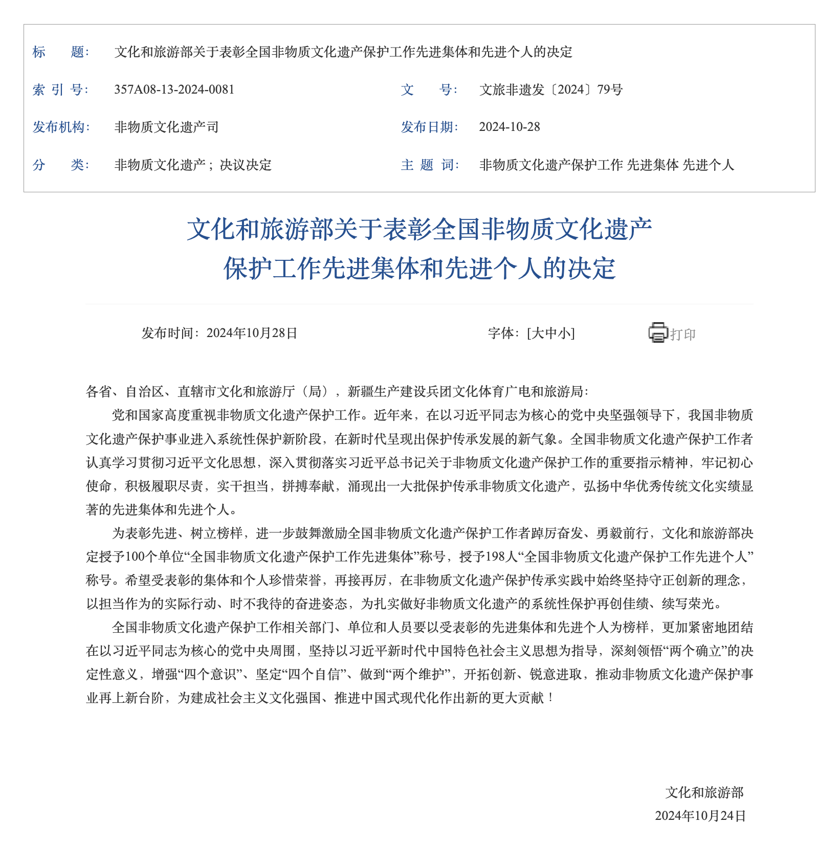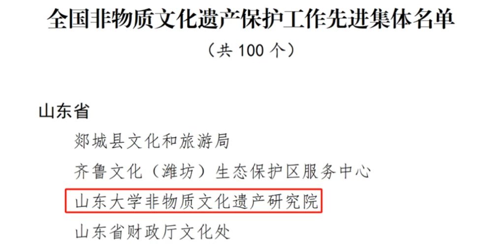 2024年10月28日,文化和旅游部发布《文化和旅游部关于表彰全国非物质文化遗产保护工作先进集体和先进个人的决定》。太阳成集团tyc151cc非物质文化遗产研究院被授予“全国非物质文化遗产保护工作先进集体”称号。