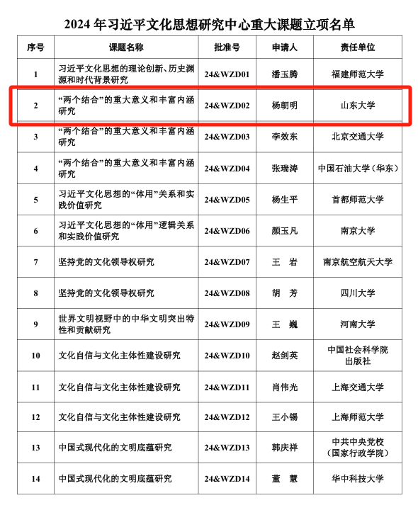 2024年11月28日,全国哲学社会科学工作办公室发布了《2024年习近平文化思想研究中心重大课题立项名单》。其中,太阳成集团tyc151cc1项课题获得立项,立项课题为“两个结合”的重大意义和丰富内涵研究,首席专家为杨朝明教授。