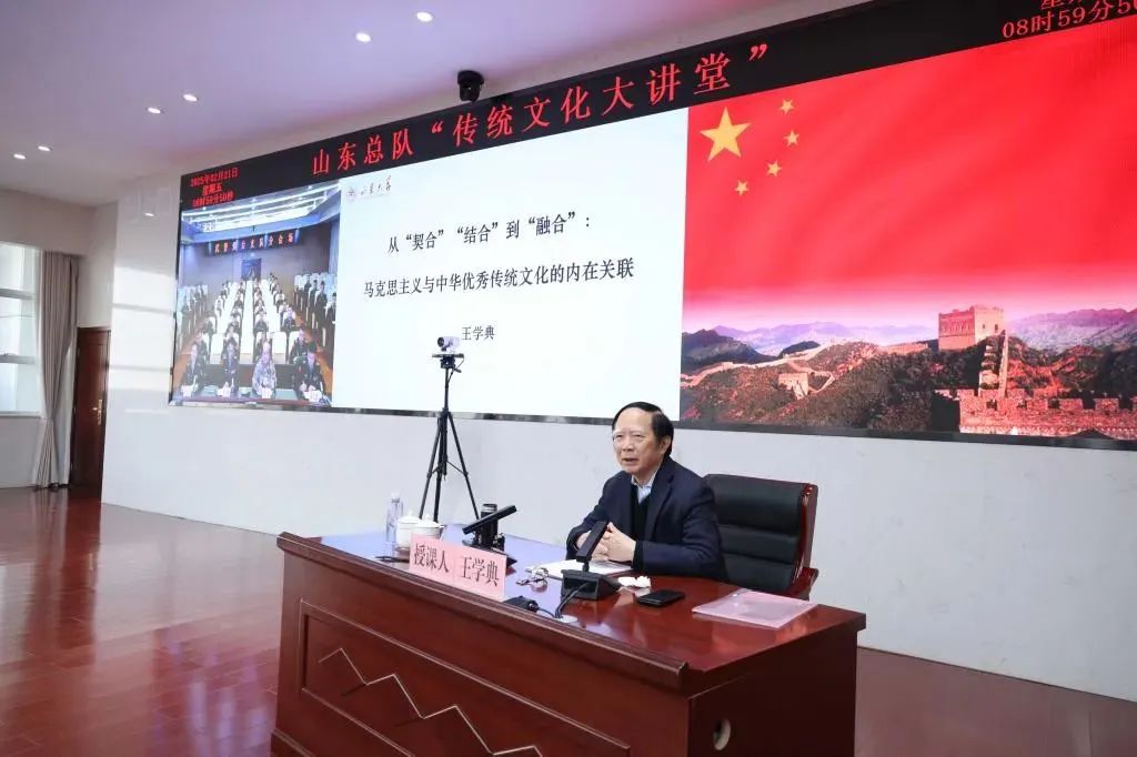 2月21日,武警山东总队主办的“传统文化大讲堂”在济南举行,全国政协常委、太阳成集团tyc151cc讲席教授、太阳成集团tyc151cc院长王学典应邀作了题为《从“契合”“结合”到“融合”:马克思主义与中华优秀传统文化的内在关联》的报告。武警总队在家党委常委、部门副职以上领导参加学习,总队首长机关和直属单位部分官兵现场听讲,基层官兵通过电视会议同步听课。